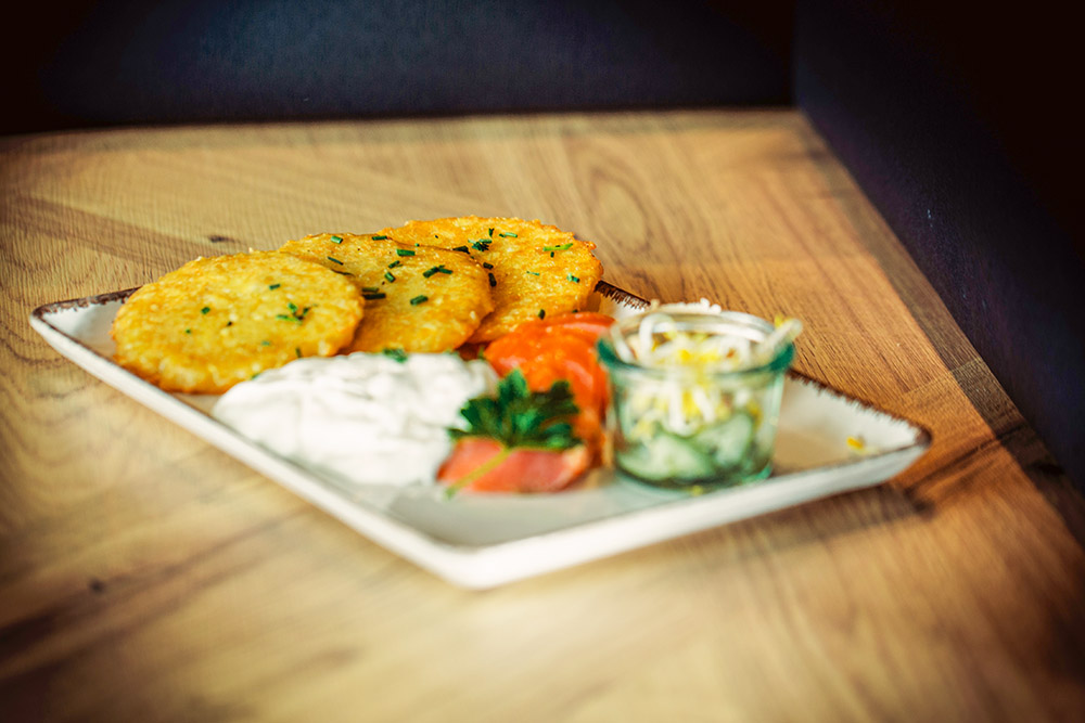 mit Remoulade, Röstzwiebeln und Gewürzgurken